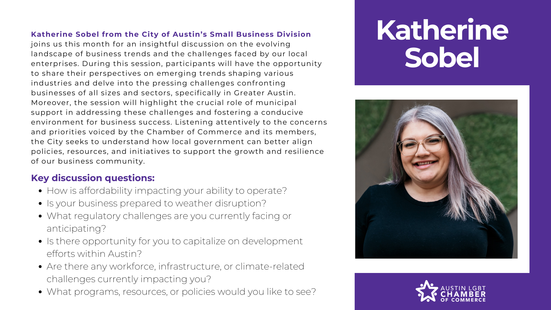 Katherine Sobel will be our speaker for March! Katherine is a Program Manager for the City of Austin's Economic Development Department – Small Business Division.